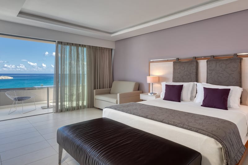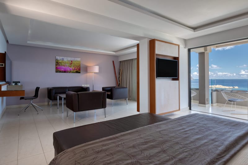This Executive Suite offers an unobstructed direct sea view and an open plan living room with modern furniture and decoration, King size bed and possibility of one extra sofa bed.